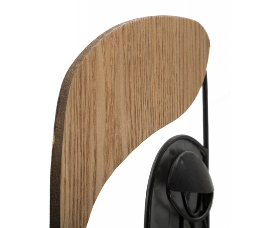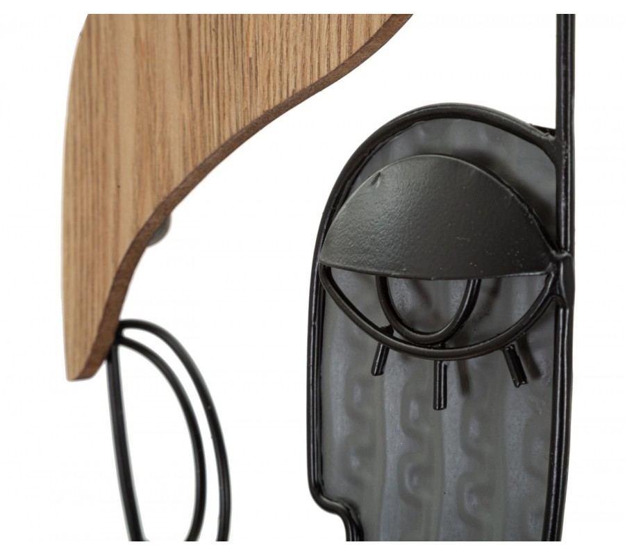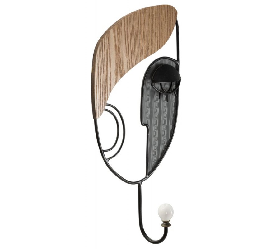 Závesný vešiak Donna spája praktickosť a originálny dizajn v modernom štýle. Kovová konštrukcia v čiernej farbe vytvára elegantnú kontúru abstraktnej tváre, ktorá je doplnená o hnedé drevené prvky a jemne štruktúrovaný sivý povrch.