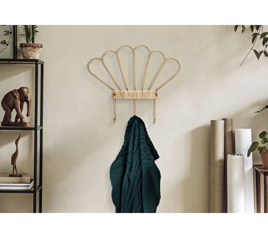 Základňa, z ktorej vychádzajú tri pevné háky, je celá obalená ratanovým výpletom, vďaka čomu pôsobí prirodzene a štýlovo. Háky sú kovové, odolné a vhodné na zavesenie oblečenia, doplnkov či tašiek.