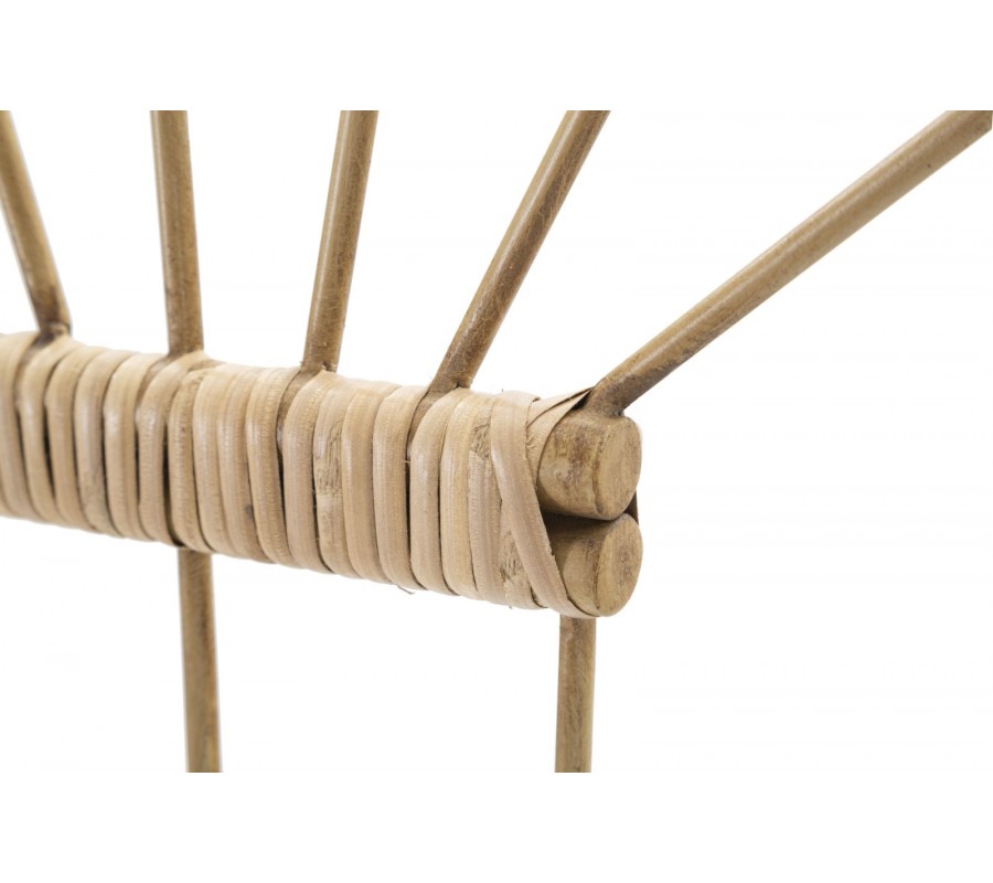 Nástenný vešiak Lania v etno štýle kombinuje kovovú konštrukciu s ratanovým dizajnom v hnedej farbe, čím vytvára harmonický prírodný vzhľad. Vrchná časť vešiaka má tvar rozkvitnutého kvetu so šiestimi oblými lupeňmi, ktoré pôsobia vzdušne a dekoratívne.