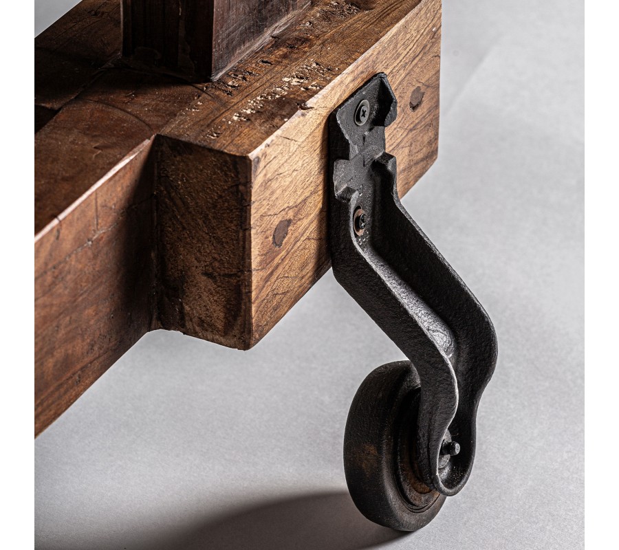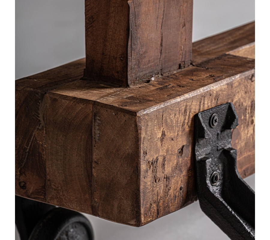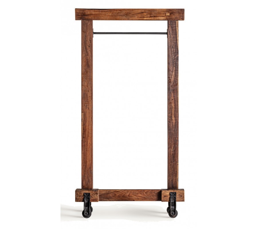 Luxusný industriálny hnedý vešiak Zarilon zaujme robustným prevedením a praktickým riešením na každodenné používanie. Vyrobený je z masívneho mangového dreva v teplom hnedom odtieni s výraznou kresbou letokruhov, čo mu dodáva autentický prírodný charakter. Konštrukcia má obdĺžnikový tvar a stojí na štyroch otočných kolieskach, vďaka čomu sa jednoducho presúva.