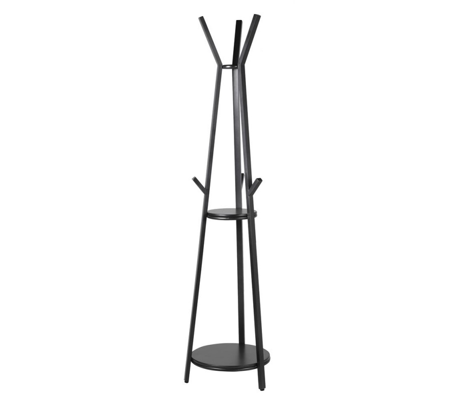 Nad hornou policou sa nachádzajú tri háčiky na zavesenie odevov, zatiaľ čo hornú časť stojana uzatvárajú ďalšie tri háčiky, ktoré zároveň tvoria zakončenie konštrukcie. Kombinácia kovu a dreva pôsobí robustne, no zároveň elegantne, pričom čierne prevedenie dodáva vešiaku moderný industriálny charakter.