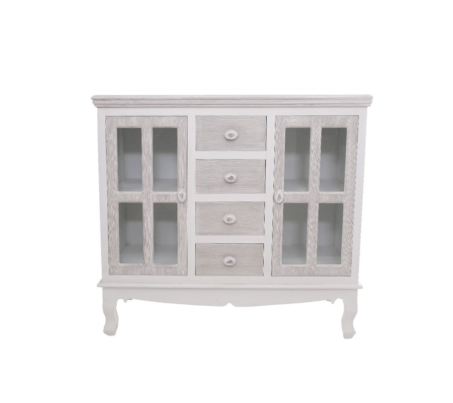 Príborník ponúka úschovu predmetov vo svojich štyroch zásuvkách a za svojimi dvoma dvierkami. Vyrobený z patinovaného dreva v šedej a bielej farbe.