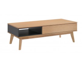 Škandinávsky obdĺžnikový konferenčný stolík Nordica Clara z dreva svetlo hnedej farby so zásuvkou a čiernou poličkou dub 120cm