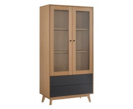 Drevená škandinávska vitrína Nordica Clara so sklenenými dvierkami vo svetlo hnedej farbe a dvoma čiernymi zásuvkami 180cm