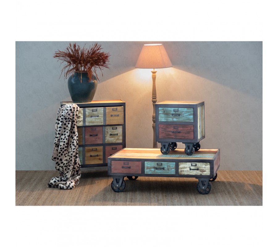 Komoda je vyrobená z masívneho jedľového dreva, jej povrch je morený v príjemných tlmených tónoch hnedej a červenej.