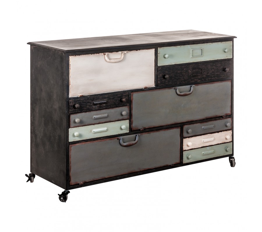 Praktická komoda na kolieskach v priemyselnom štýle je vyrobená z kovu. Povrch je čiernej matnej farby, doplnený o pastelové odtiene zelenej a ružovej farby. Tento kúsok nábytku môžeme kombinovať s tmavou alebo svetlou jednoduchou stenou.