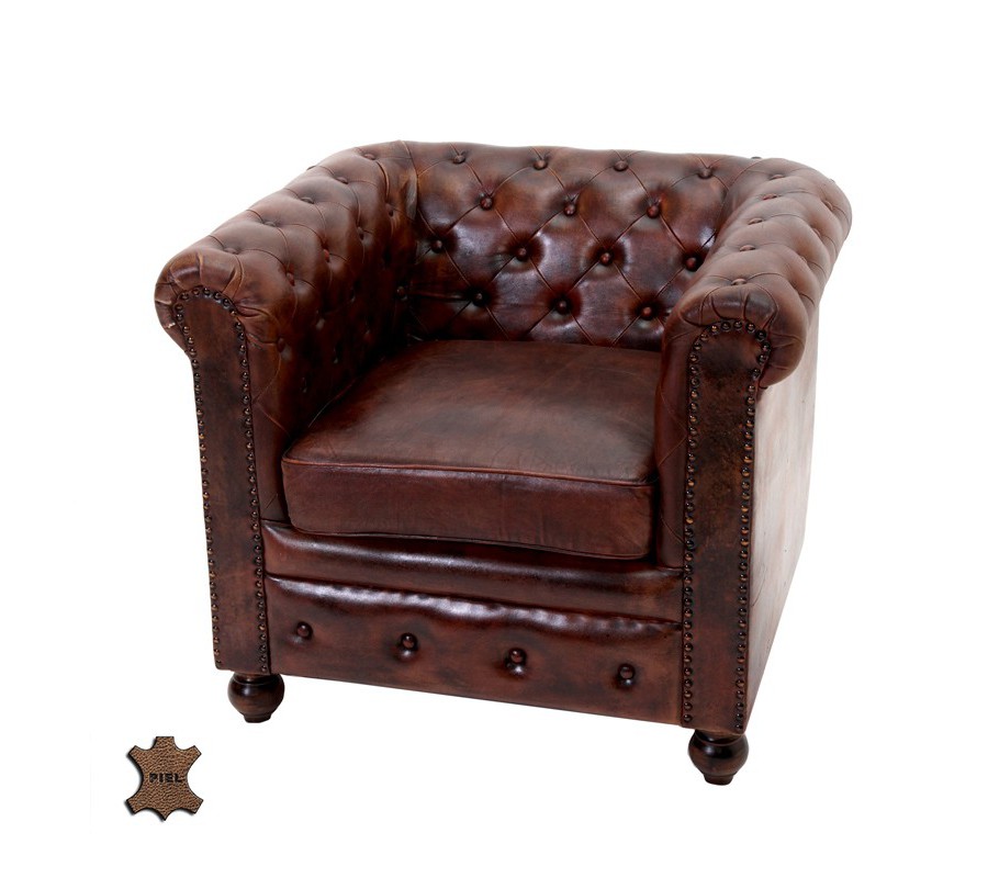 Kreslo potiahnuté hnedou kožu v štýle chesterfield je zárukou kvality a elegancie. Skvele sa dopĺňa s trojmiestnou sedačkou, ktorú možno tiež nájsť v našej ponuke.