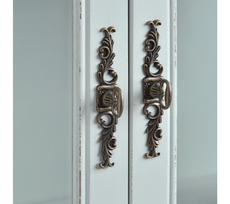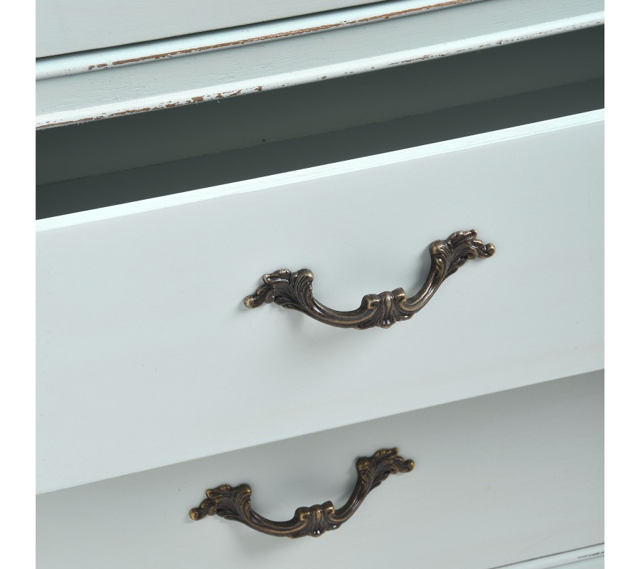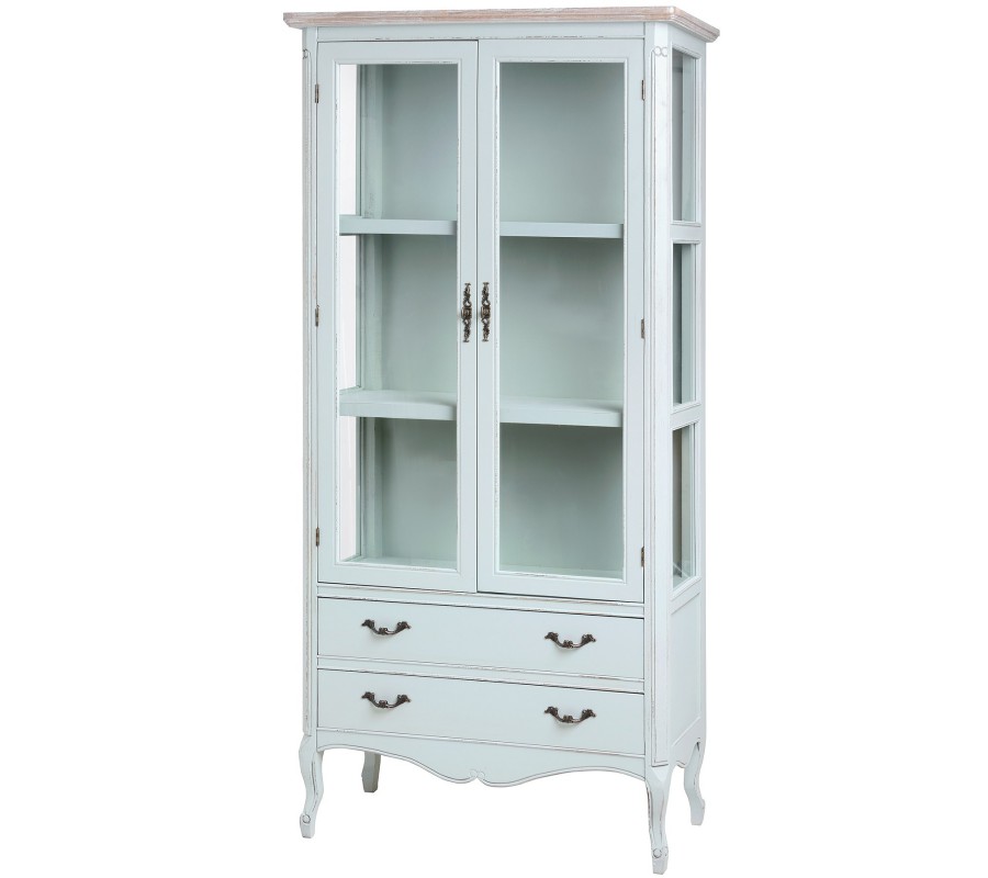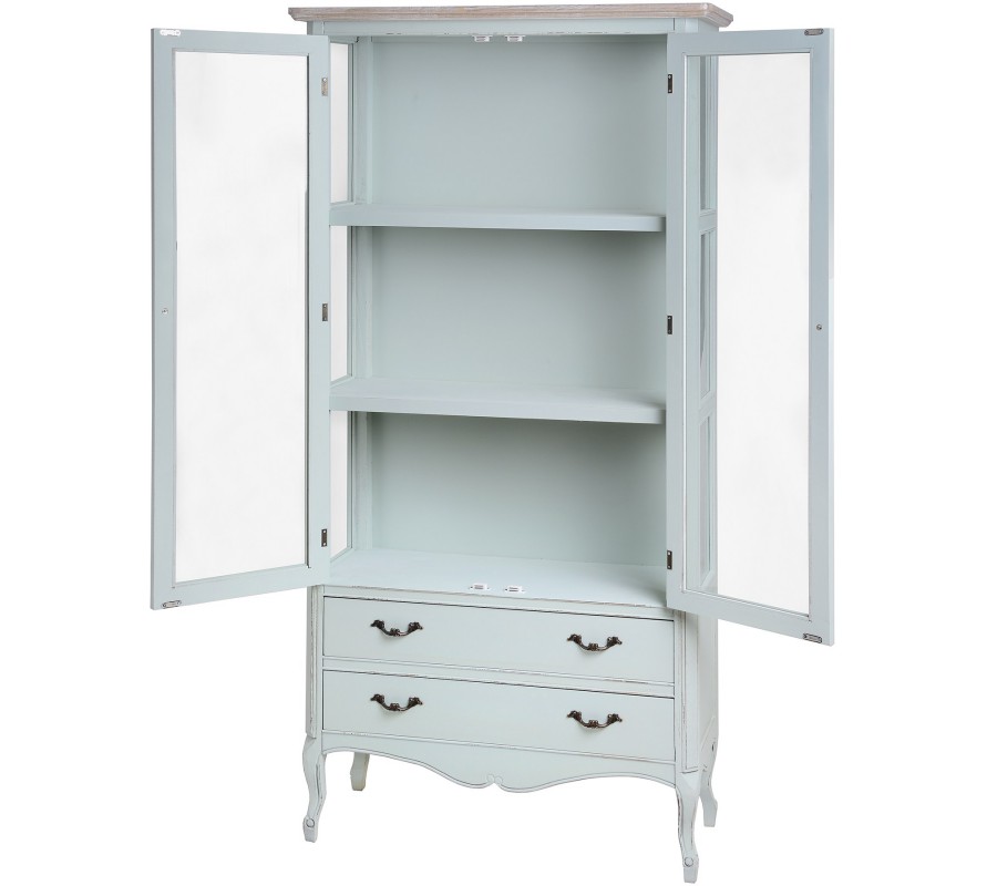 Vitrína s dvoma spodnými zásuvkami v jednoduchom vidieckom štýle s jemne modrastým pastelovým náterom.