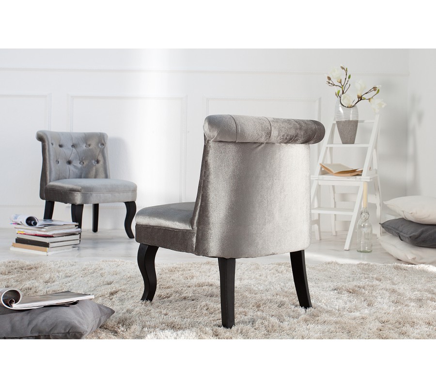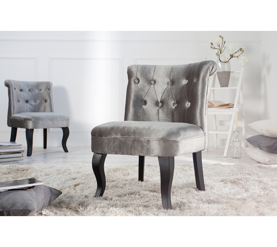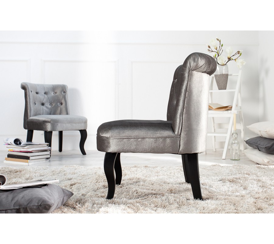 Štýlové retro kreslo striebornej farby je ideálnou voľbou do moderne zariadených interiérov. Zamatové čalúnenie je opatrené ozdobnými cvočkami, ktoré prepožičiavajú kreslu ojedinelý vzhľad. Nôžky sú vyrezávané z brezového dreva do elegantného zahnutého tvaru.