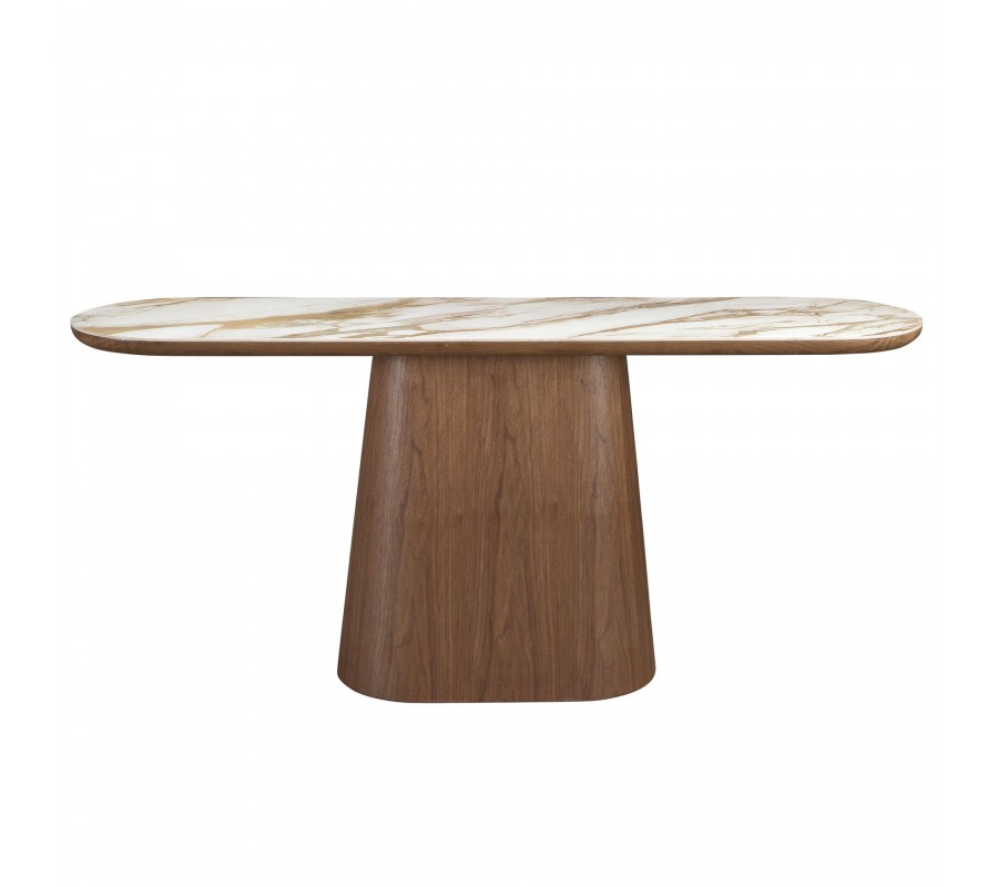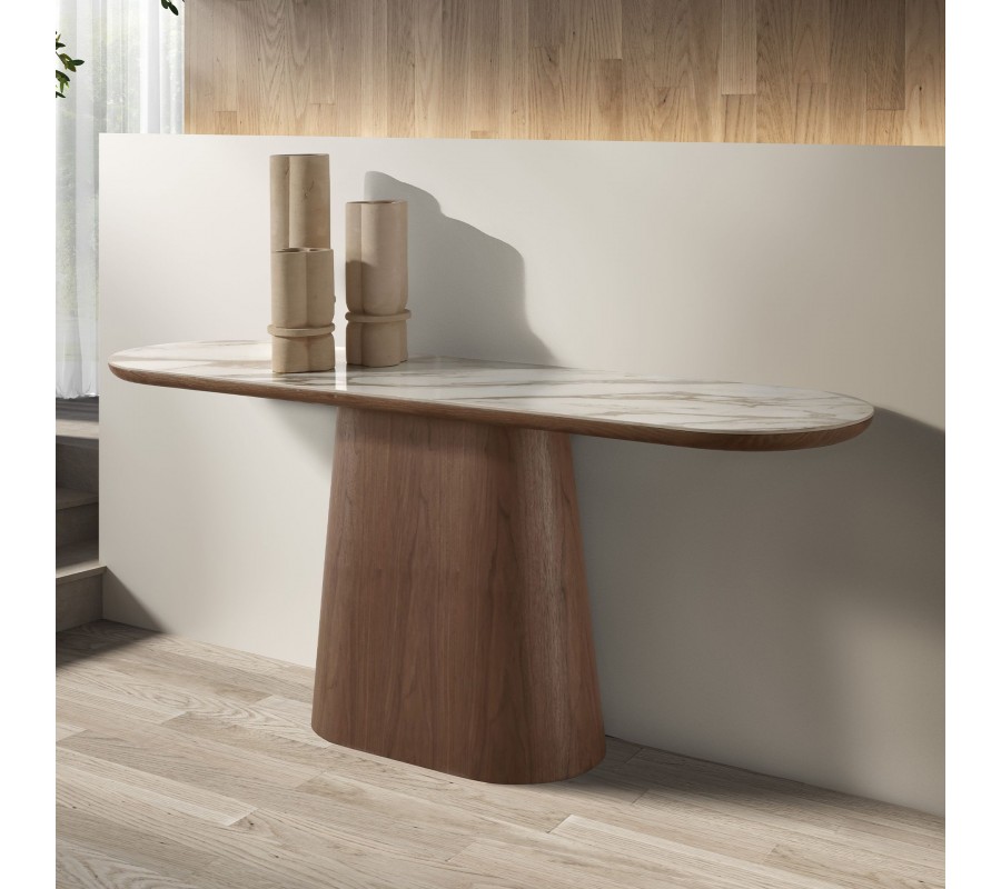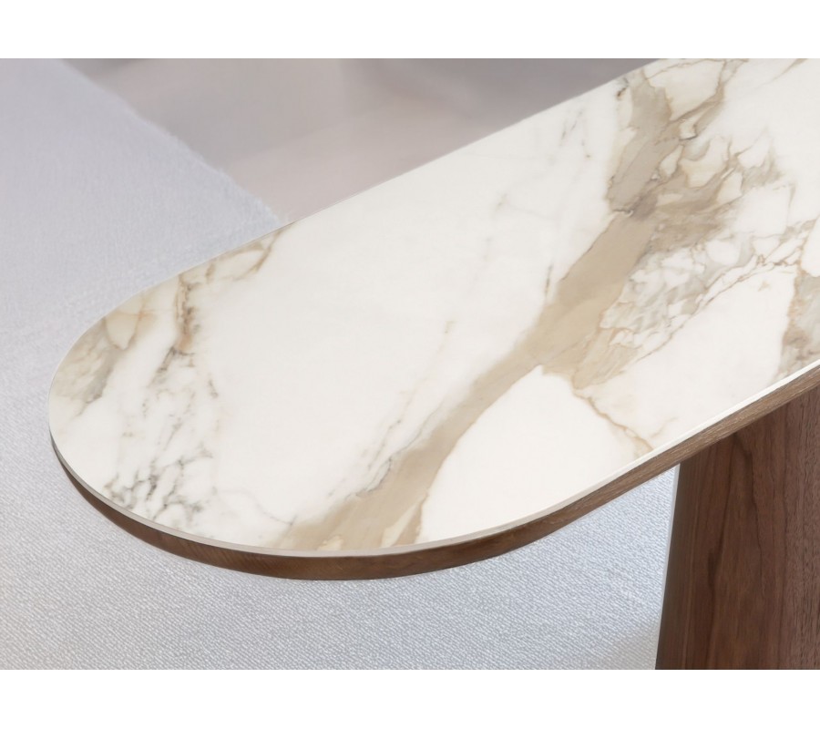 Luxusný moderný oválny konzolový stolík Vita Naturale doskou s bielym mramorovým dizajnom a orechovou hnedou podstavou 180 cm