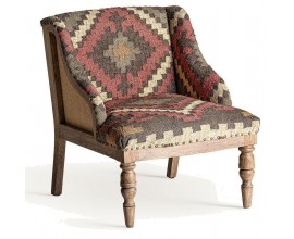 Luxusný etno vzorované čalúnené kreslo Luris s jutovým poťahom v zemitých farbách z masívneho hnedého dreva s nitmi 77 cm