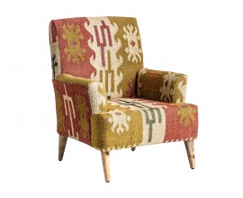 Luxusné etno orientálne čalúnené žlto červené vzorované kreslo Reria s hnedými masívnymi drevenými nožičkami 90 cm