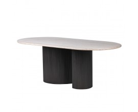 Luxusný art deco oválny jedálenský stôl Traverte z travertínu v bielej farbe a s čiernou kovovou zakrivenou nohou 200 cm