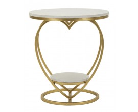 Dizajnový kovový zlatý príručný stolík Amorattia v tvare srdca s mramorovými okrúhlymi bielymi doskami so sivými žilkami 45 cm