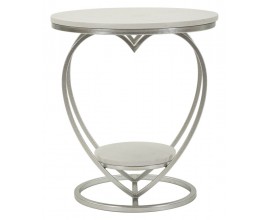 Dzajnový okrúhly príručný stolík Amorattia s bielymi mramorovými doskami a kovovou striebornou konštrukciou v tvare srdca 45 cm