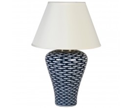Vintage porcelánová modro-biela stolná lampa Waverly s kresbou rybičiek a bielym tienidlom 68cm