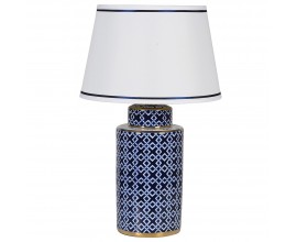 Art-deco porcelánová modrá stolná lampa Laponda s bielou geometrickou kresbou a bielym tienidlom 70cm