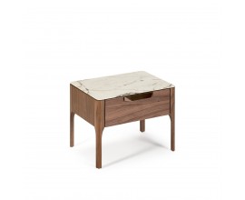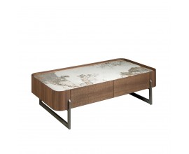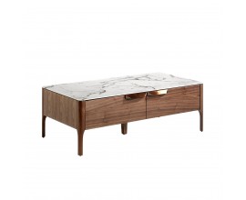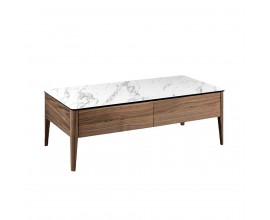 Luxusný moderný hnedý konferenčný stolík Vita Naturale s dvomi zásuvkami a vrchnou doskou s dizajnom bieleho mramoru 120 cm