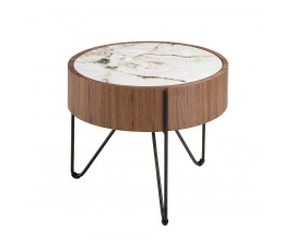 Luxusný moderný okrúhly príručný stolík Vita Naturale z dreva v hnedej farbe s vrchnou doskou s dizajnom bieleho mramoru 50 cm
