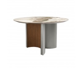 Luxusná moderná jedálenská zostava Vita Naturale v kombinácii orechového hnedého dreva s bielym mramorom a béžovou kožou