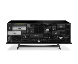 Luxusný art deco sivý príborník Forma Moderna so štyrmi dvierkami s preskleným prvkom a vnútorným osvetlením 180 cm