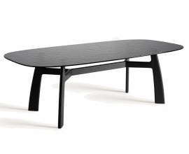 Moderný sklenený konferenčný stolík Diveni Black v obdĺžnikovom tvare s ratanovou doskou a čiernou kovovou podstavou 132cm