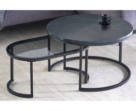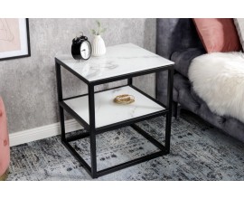 Industriálny nočný stolík Industria Marbleux z bezpečnostného skla s bielym mramorovým vzhľadom s čiernou kovovou podstavou 45cm