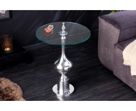 Dizajnový príručný stolík Marietta s okrúhlou sklenenou vrchnou doskou a ozdobnou striebornou podstavou 65cm