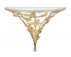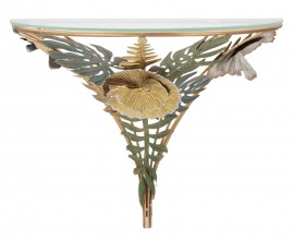 Sklenený glamour polkruhový konzolový stolík Exotica so zlatou konštrukciou a florálnym zdobením v odtieňoch zelenej 45 cm