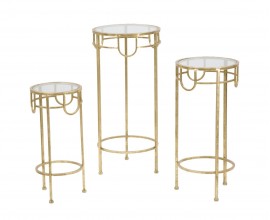 Dizajnová glamour sada okrúhlych príručných stolíkov Solara so sklenenou doskou a zlatým kovovým rámom s detailmi 70 cm
