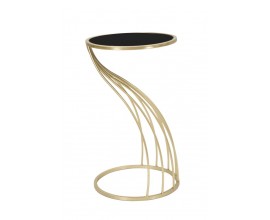 Art deco kovový zlatý kovový okrúhly príručný stolík Alisia s vrchnou sklenenou čiernou doskou s oblými detailmi 80 cm