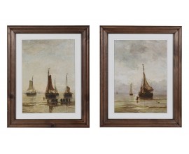 Štýlový set koloniálnych obdĺžnikových obrazov Lencan s hnedým rámom z masívneho vyrezávaného dreva s námorníckym motívom 50 cm