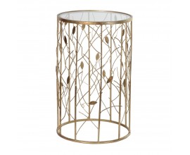 Dizajnový okrúhly zlatý kovový príručný stolík Natura Elegante s florálnym zdobením a vrchnou sklenenou doskou 60 cm