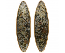 Dizajnová vintage nástenná dekorácia Serenity s dvomi oválnymi panelmi s motívom vtákov v odtieňoch zelenej a zlatej 90 cm
