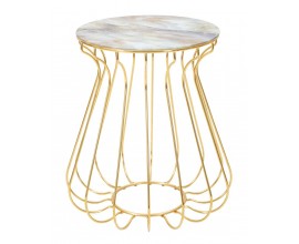 Art deco príručný stolík Amadora so zlatou kovovou konštrukciou a okrúhlou bielou sklenenou doskou s mramorovým efektom 50 cm