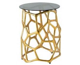 Glamour okrúhly kovový príručný stolík Kalan so zlatou perforovanou nohou a vrchnou sklenenou sivou doskou 49 cm