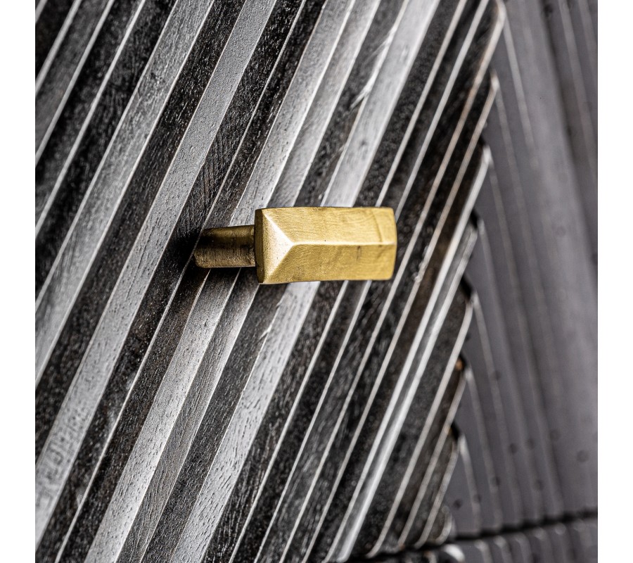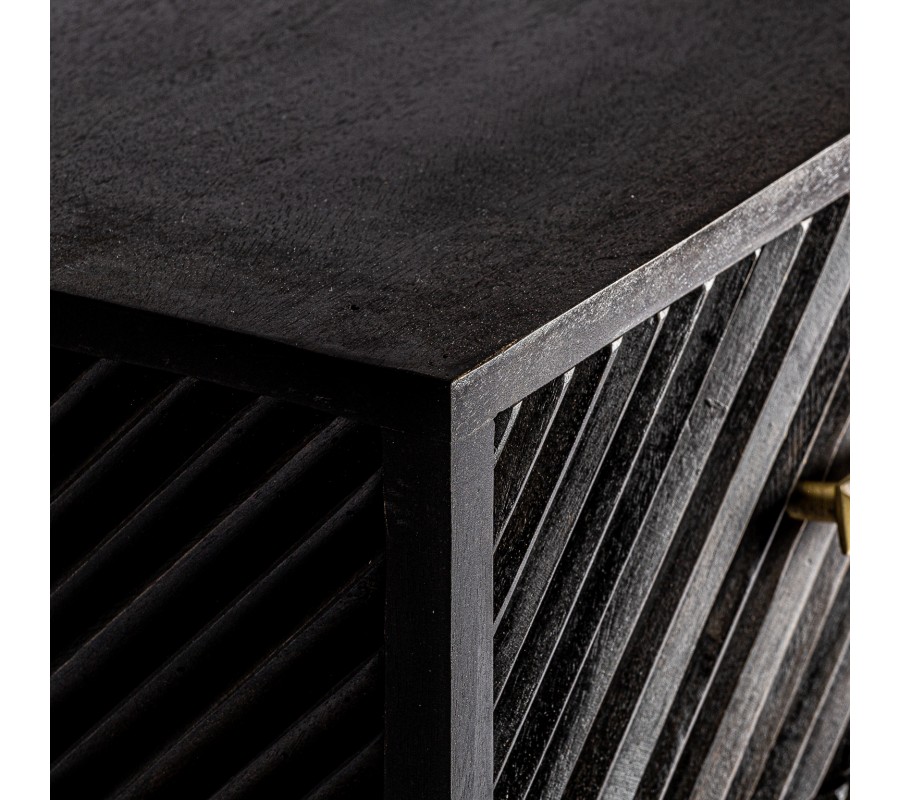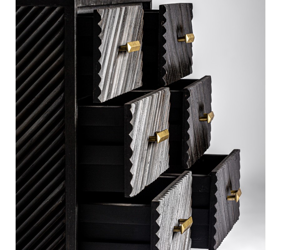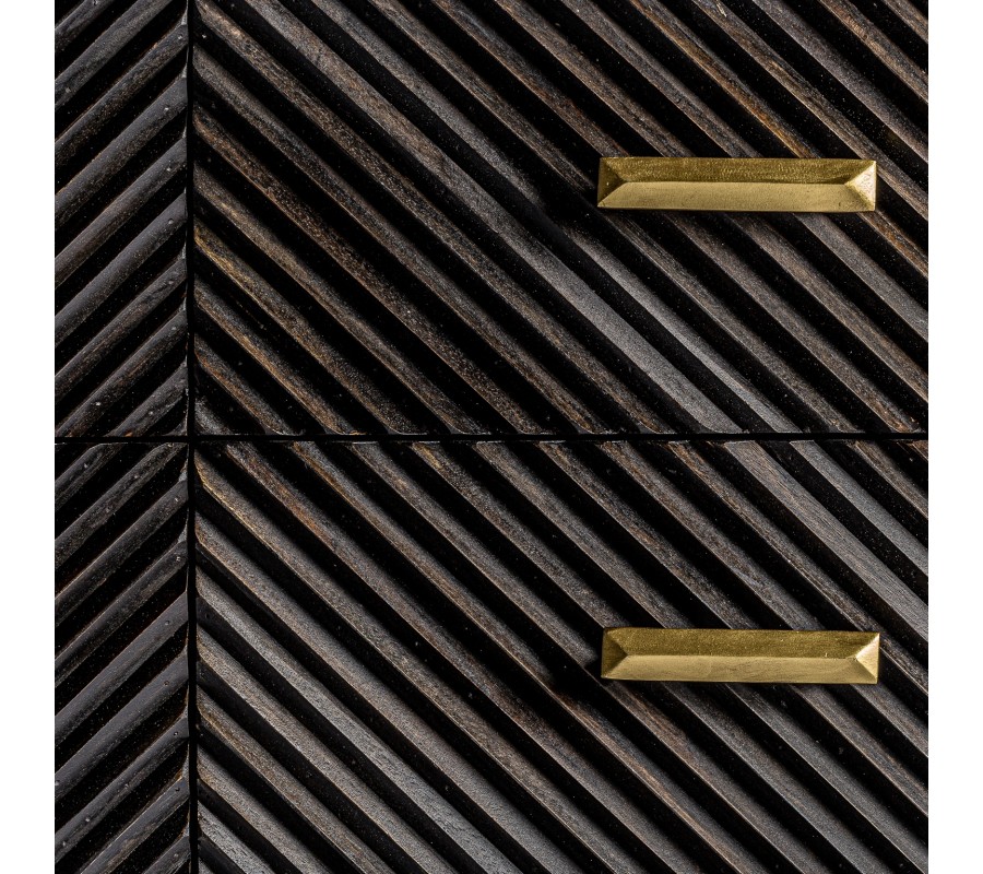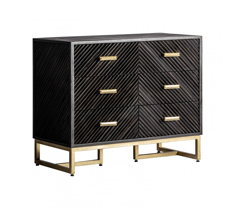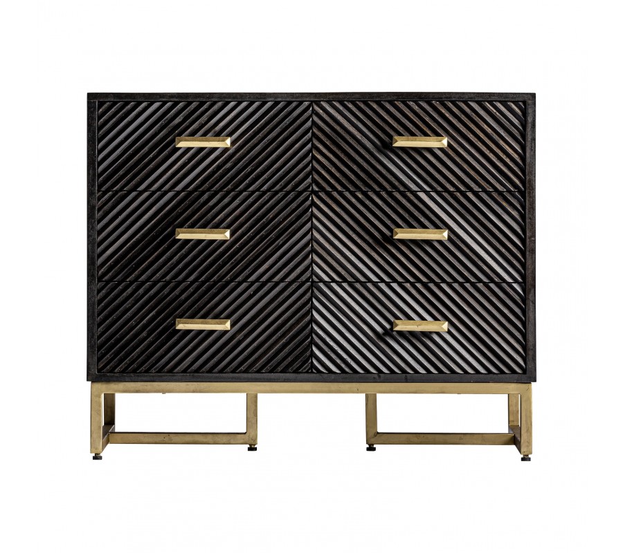 Jedinečná a nadčasová komoda z rady Romienn disponuje naozaj vkusným telom tvoreným kombináciou čierneho mangového masívneho dreva a kovových nôh zlatej farby. Luxusná komoda Vám poskytne dostatok úložného priestoru v podobe šiestich priestranných zásuviek s minimalistickými priamymi rukoväťami zlatej farby. Telo komody je zdobené lineárnym členením na prednej strane, ktoré mu dodáva naozaj moderný a súčasný nádych. Masívnu komodu Romienn odporúčame kombinovať najmä so živou zeleňou a zlatými dekoráciami v rámci vkusných moderných spální, obývačiek či hosťovských izieb.
