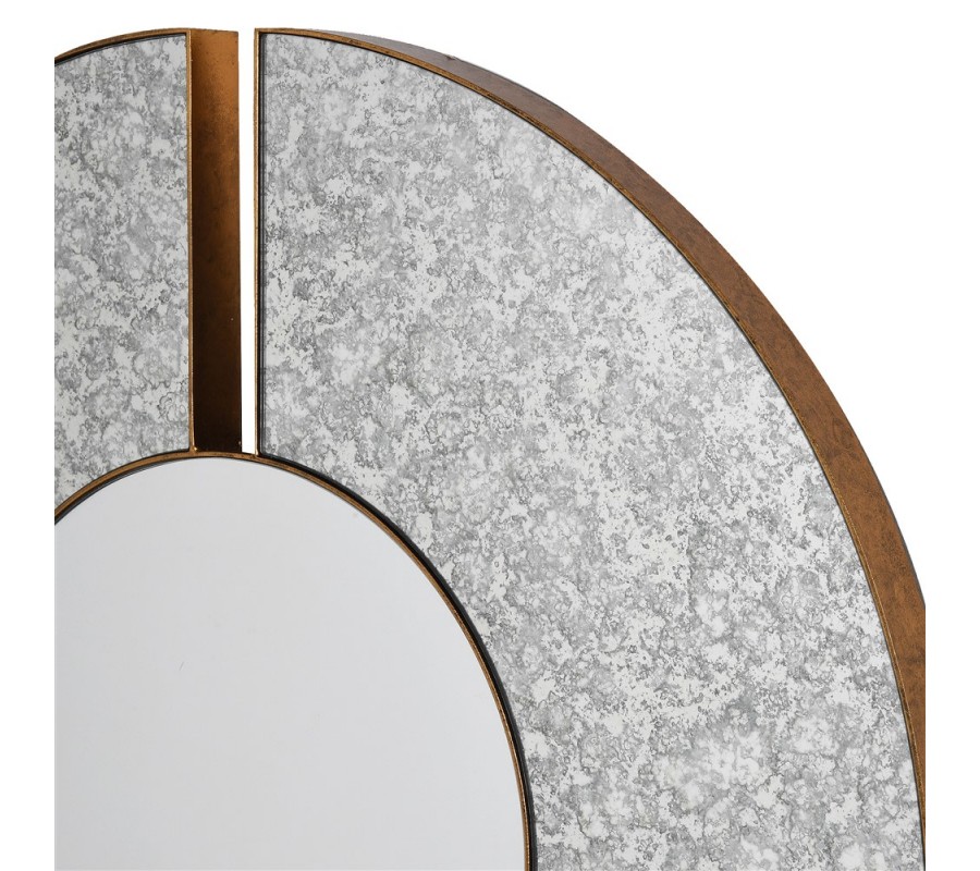 Okrúhle art deco zrkadlo Develly so dekoratívnym rámom v zlatej kovovej farbe so sivou výplňou 86cm