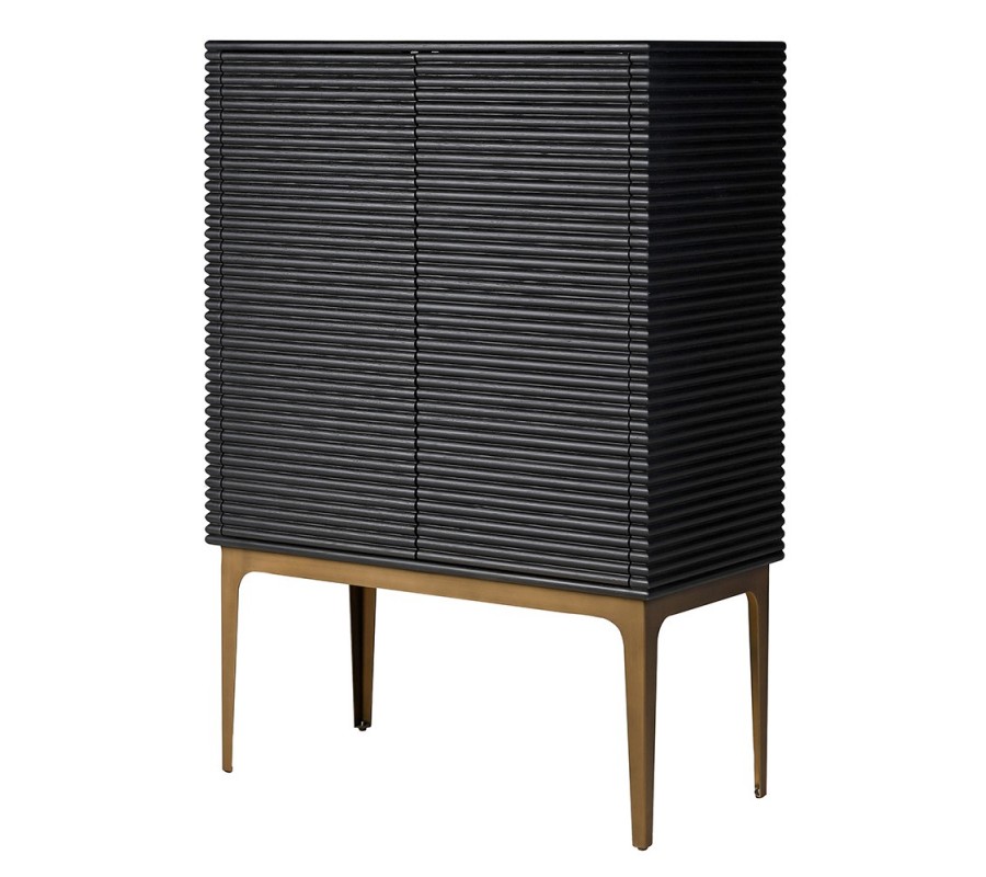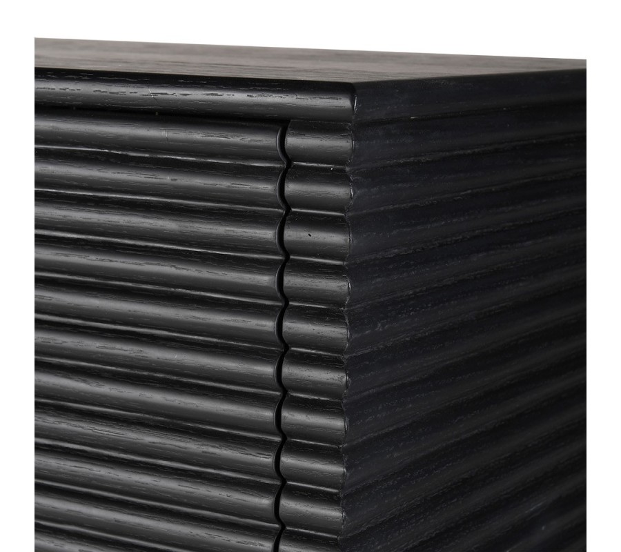 Skrinka je zhotovená z dubového dyhovaného dreva a jej povrch zdobí moderný drážkovaný reliéf. Jeho línie plynú horizontálne a každá lamela je tvarovaná do poloblúkového tvaru, ktorý zjemňuje inak lineárny charakter nábytku. Lakovanie v matnej čiernej farbe pôsobí elegantným dojmom a umožňuje široké možnosti kombinovania s ďalším nábytkom,