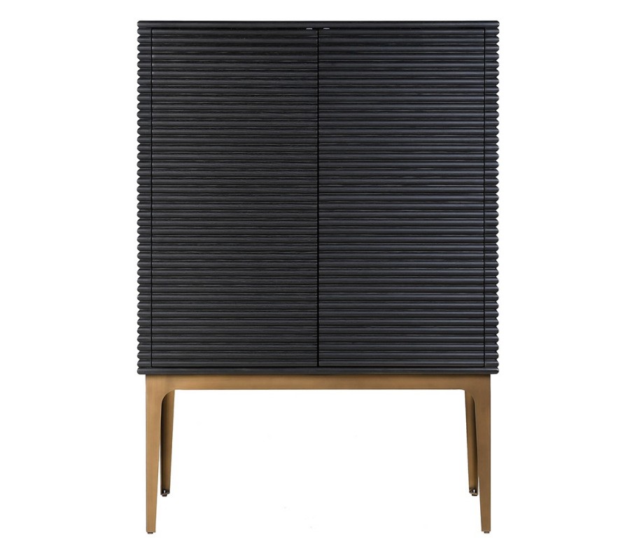 Luxusná art deco barová skrinka Quido s vyrezávaným lineárnym zdobením v čiernej farbe so zlatými detailmi 131 cm
