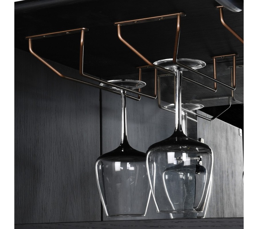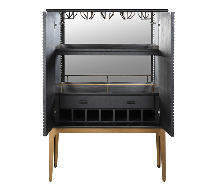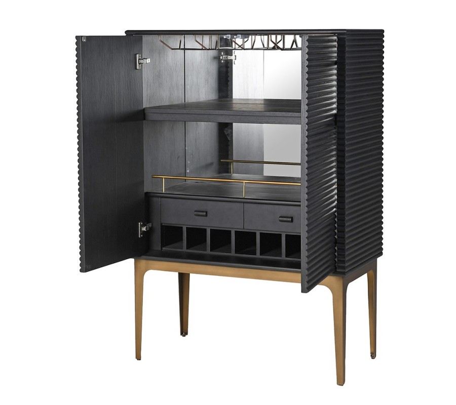 Barová skrinka vás očarí aj svojím interiérom. Za dvojitými dvierkami sa nachádza bohatý úložný priestor predelený drevenou policou. V spodnej časti sú umiestnené dve zásuvky na menšie predmety a pod nimi priečinky na uskladnenie fliaš. Na strope skrinky je upevnený kovový držiak na poháre na stopke. Spodná odkladacia plocha je ohraničená vyvýšeným kovovým okrajom v zlatom prevedení, ktorý vnáša exkluzívny vizuál aj do vnútorného priestoru. Zadnú stenu pokrýva zrkadlové sklo.