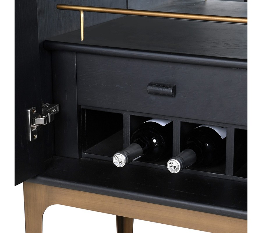 Barová skrinka Quido vás očarí svojím extravagantným geometrickým zdobením v štýle art deco. Čierna farba pôsobí elegantným moderným dojmom a zlatá kovová podstava prináša do dizajnu nádych luxusu.