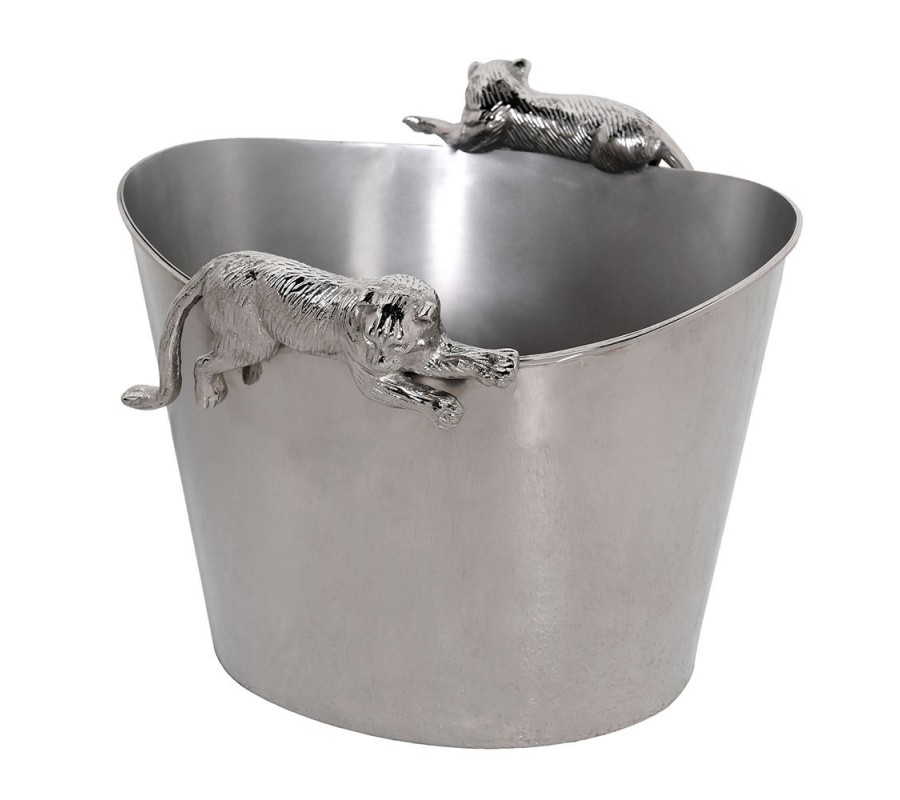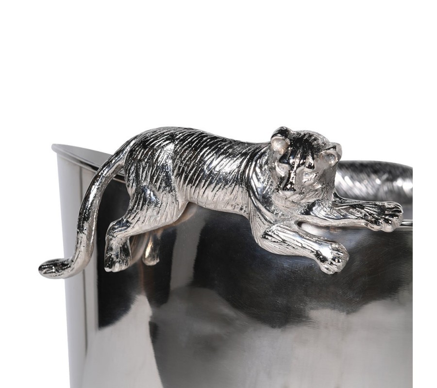 Štýlová art deco kovová nádoba na chladenie vína Salom v striebornej farbe s držiakmi v podobe tigrov 34 cm