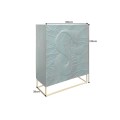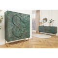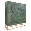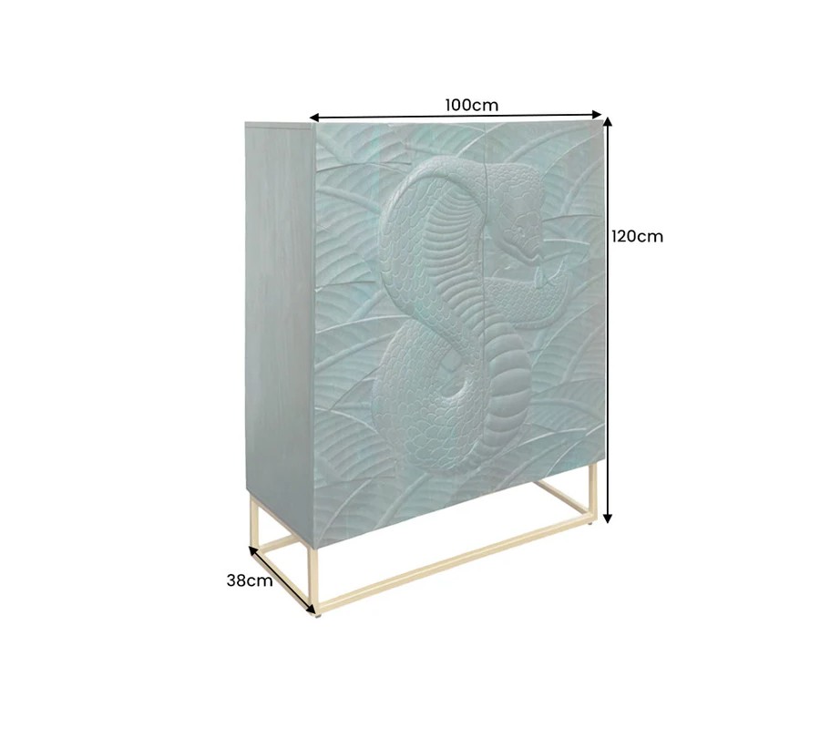 Štýlová dvojdverová tyrkysová art deco barová skrinka Cumbria s vyrezávaným hadím motívom a zlatou kovovou konštrukciou 120 cm