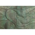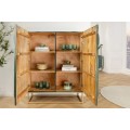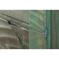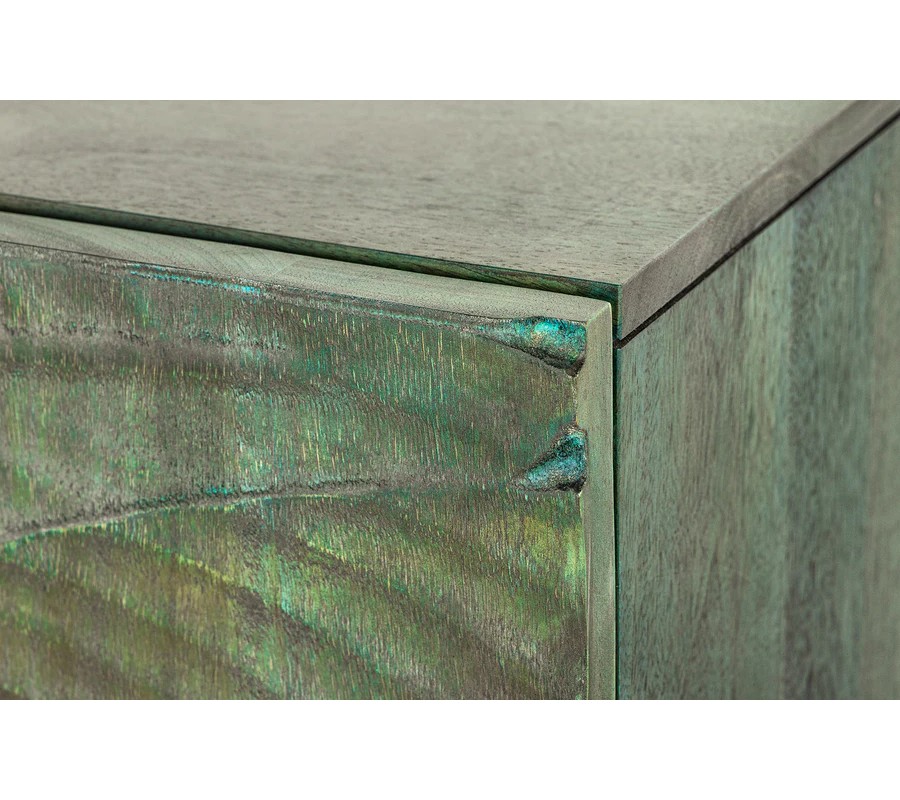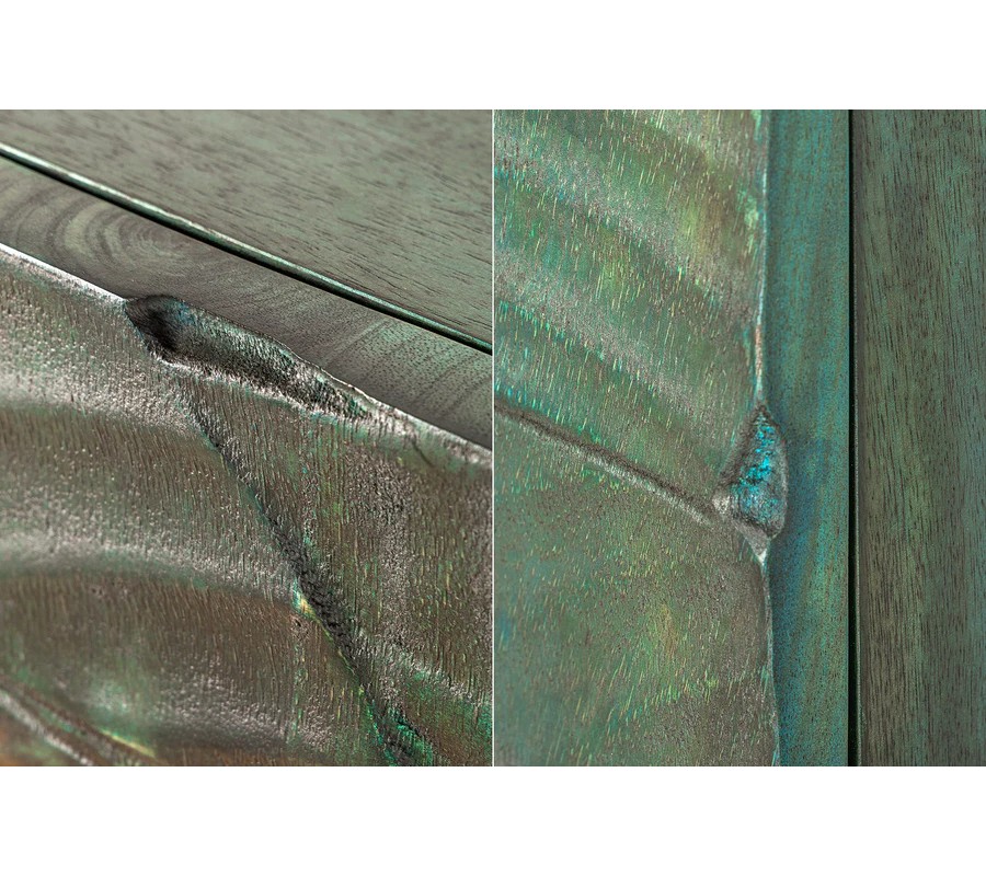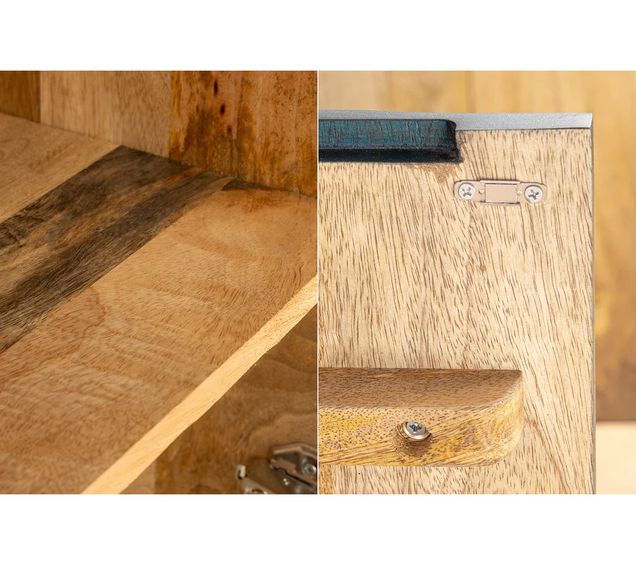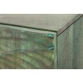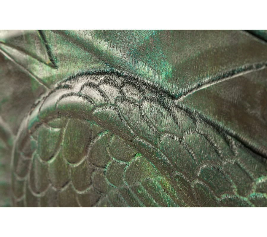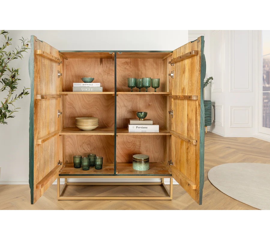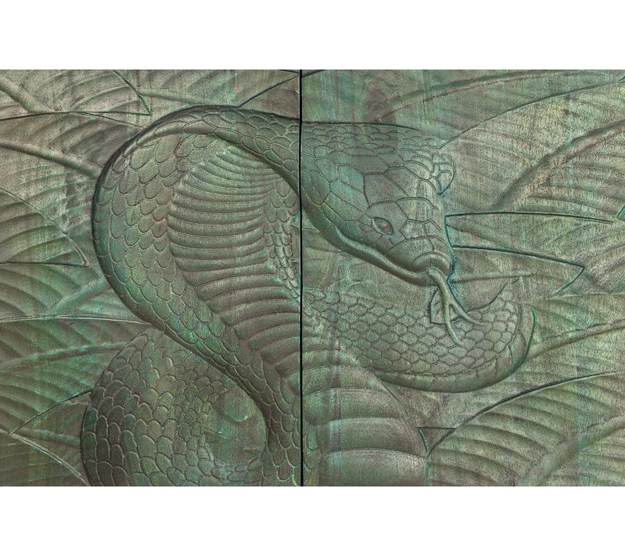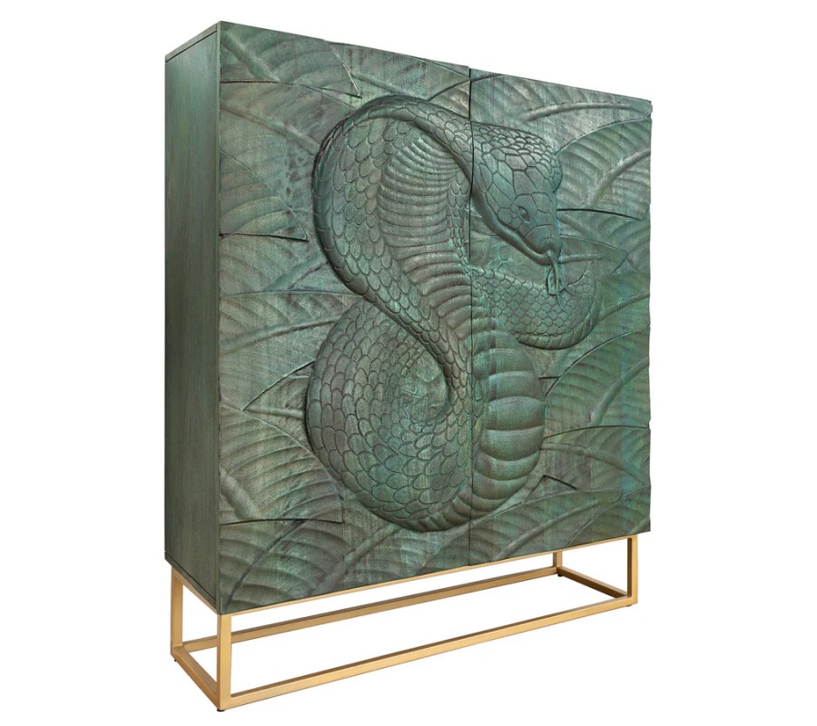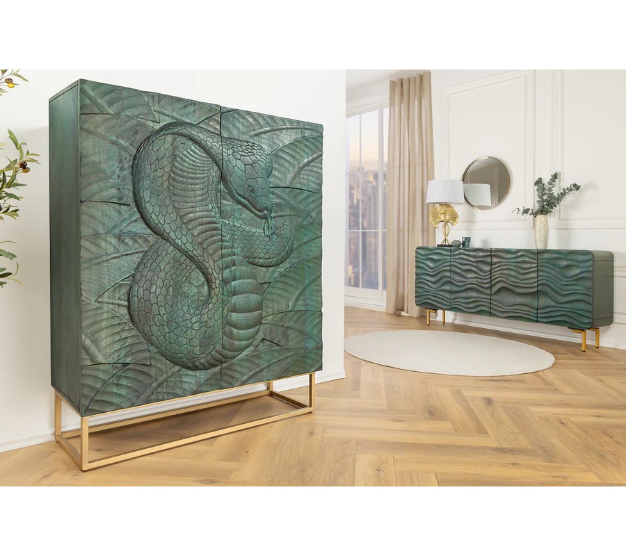 Barová dvojdverová skrinka poskytuje prístup k praktickému úložnému priestoru so šiestimi policami, ideálnymi na uskladnenie pohárov, fliaš alebo dekoračných predmetov. Prednú stranu zdobí detailné vyrezávanie kobry, ktoré pôsobí dramaticky a dodáva skrinke exotický vzhľad. Vyrezávanie je vyhotovené v tyrkysovo patinovanej farbe, čím evokuje vintage a rustikálnu eleganciu.