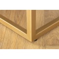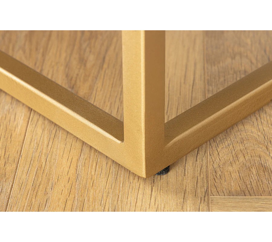 Skrinka má pravidelný obdĺžnikový tvar, pričom celkový dizajn dopĺňa minimalistická konštrukcia zlatých kovových nožičiek, ktoré zabezpečujú stabilitu a pridávajú moderný nádych. Je vyrobená z masívneho mangového dreva, známe svojou pevnosťou a textúrou.