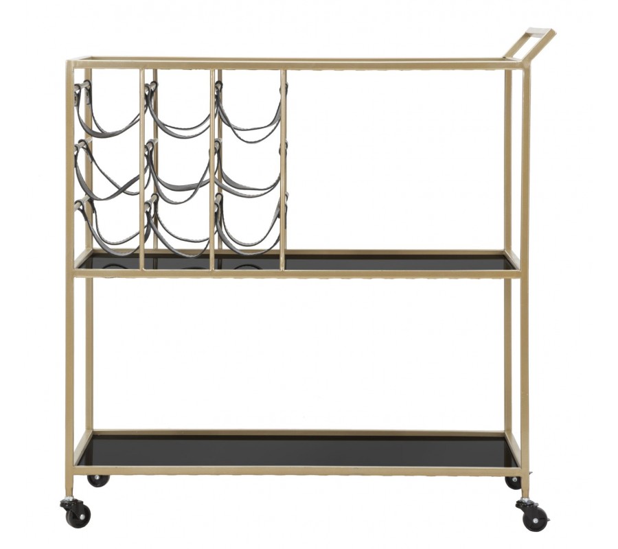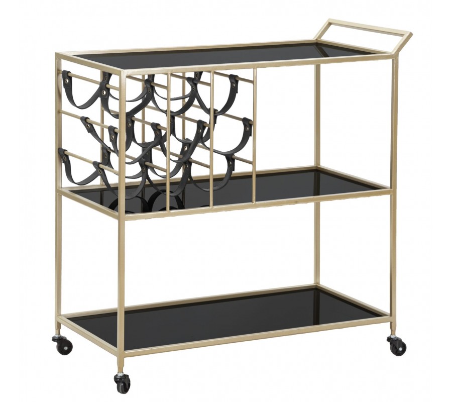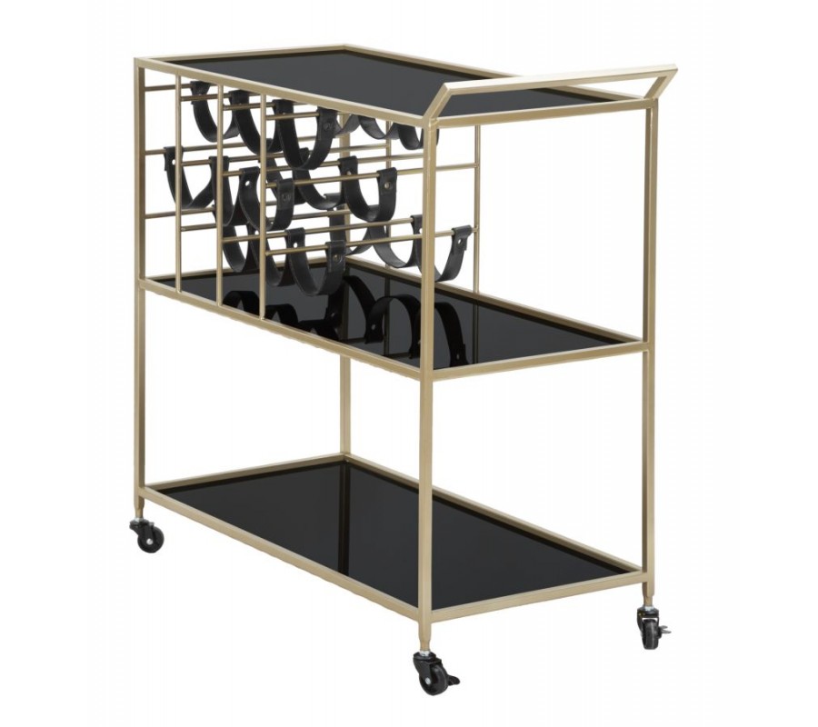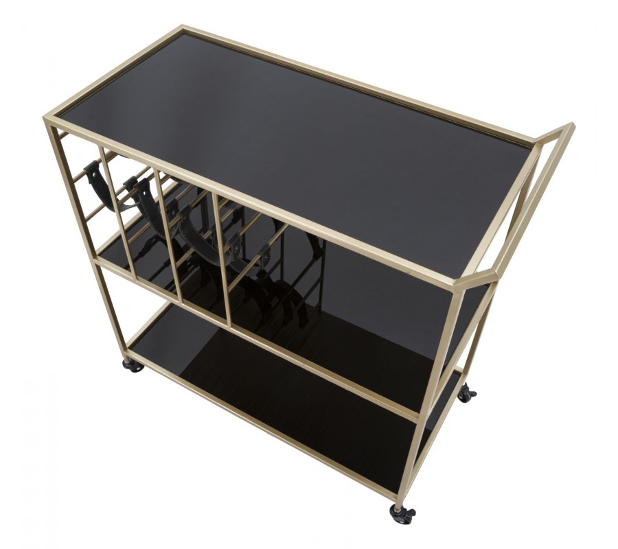 Dizajnový glamour servírovací vozík Stefano so držiakom na fľaše a tromi policami z čierneho skla a zlatou konštrukciou 79 cm