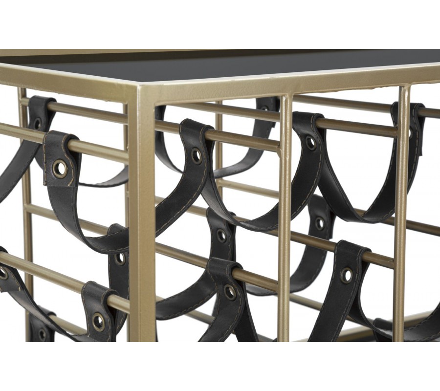 Rám tvoria štyri štíhle nožičky, ukončené v spodnej časti kolieskami a minimalistická hranatá úchytka pre jednoduchú manipuláciu s nábytkom. Polovicu strednej police vypĺňa kovová mriežka, na ktorej sú upevnené čierne popruhy z ekokože a vytvárajú tak zaujímavý skladovací priestor na deväť fliaš.