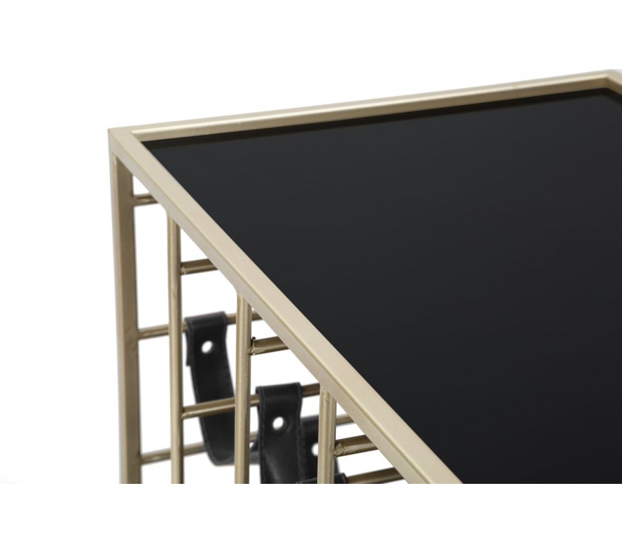 Servírovací vozík má tri obdĺžnikové police z čierneho skla, spevnené MDF dyhou. Sú umiestnené v kovom ráme v žiarivej zlatej farbe. Táto kombinácia prináša do dizajnu nádych art deco estetiky, zdôraznený geometrickou siluetou.
