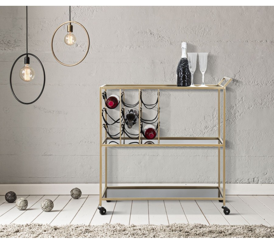 Servírovací vozík Stefano je praktickým pomocníkom do vašej jedálne či obývačky. Kombinácia čierneho skla a lesklého zlatého kovu mu dodáva luxusný glamour vizuál a oceníte aj praktický držiak na fľaše, ktorý je zároveň aj zaujímavým dizajnovým elementom.